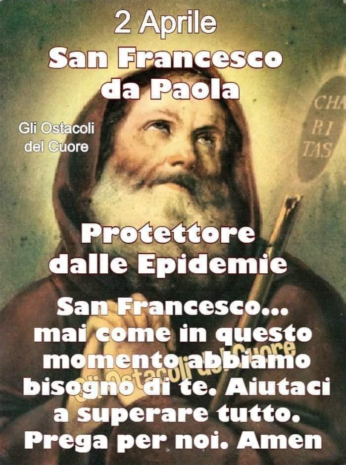 Eremita e fondatore dell’ordine dei Minimi, Francesco nacque a Paola, in provincia di Cosenza, nell’anno 1414 e morì a Tours in Francia il 2 aprile 1517 a 91 anni dopo aver vissuto 3 mesi in cella perché sentiva prossima la sua fine. Secondo il breviario romano il suo corpo rimase insepolto per 11 giorni emanava un profumo celeste. Tra i miracoli si ricorda quello dell’attraversamento dello Stretto di Messina sul suo mantello steso, dopo che il barcaiolo Pietro Coloso si era rifiutato di traghettare gratuitamente lui ed alcuni seguaci. Prodigio per il quale è stato nominato patrono della gente di mare d’Italia.