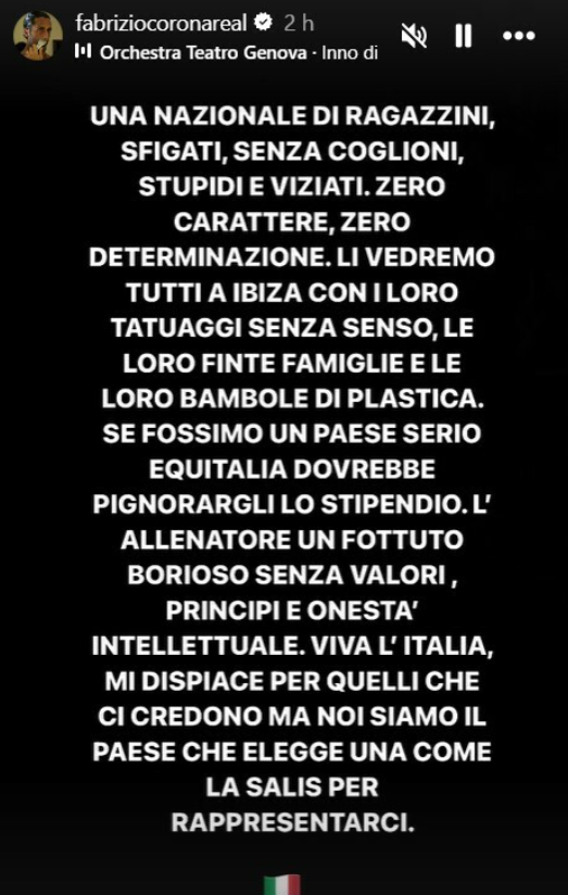 Corona ha avuto parole dure nei confronti degli azzurri ma non ha risparmiato neanche il ct sconfinando poi su questioni che non hanno attinenza con il calcio giocato. “Una nazionale di sfigati, senza cogl..ni, stupidi e viziati, zero carattere, zero determinazione, Li vedremo tutti a Ibiza con i loro tatuaggi senza senso, le loro finte famiglie, le loro bambole di plastica” – si legge nella Stories pubblicata dal siciliano.