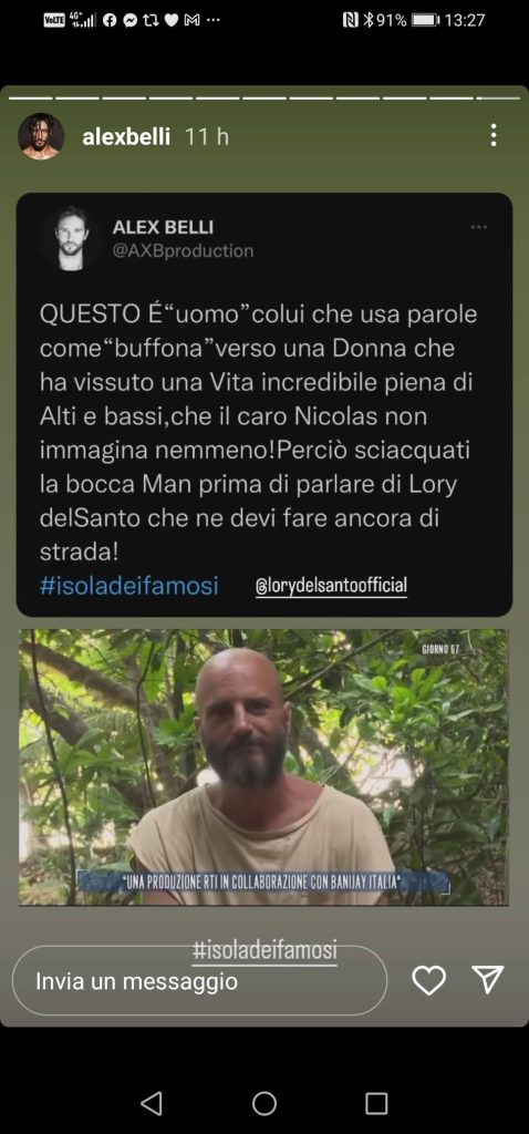 Sullo scambio di battute durante la puntata del 27 maggio de L’Isola dei Famosi è intervenuto Alex Belli che si è scagliato contro il collega. “Questo è un uomo, colui che usa parole come buffona verso una donna che ha vissuto una vita incredibile piena di alti e bassi che il caro Nicolas non immagina nemmeno. Perciò sciacquati la bocca man prima di parlare di Lory Del Santo che ne devi fare ancora di strada”.