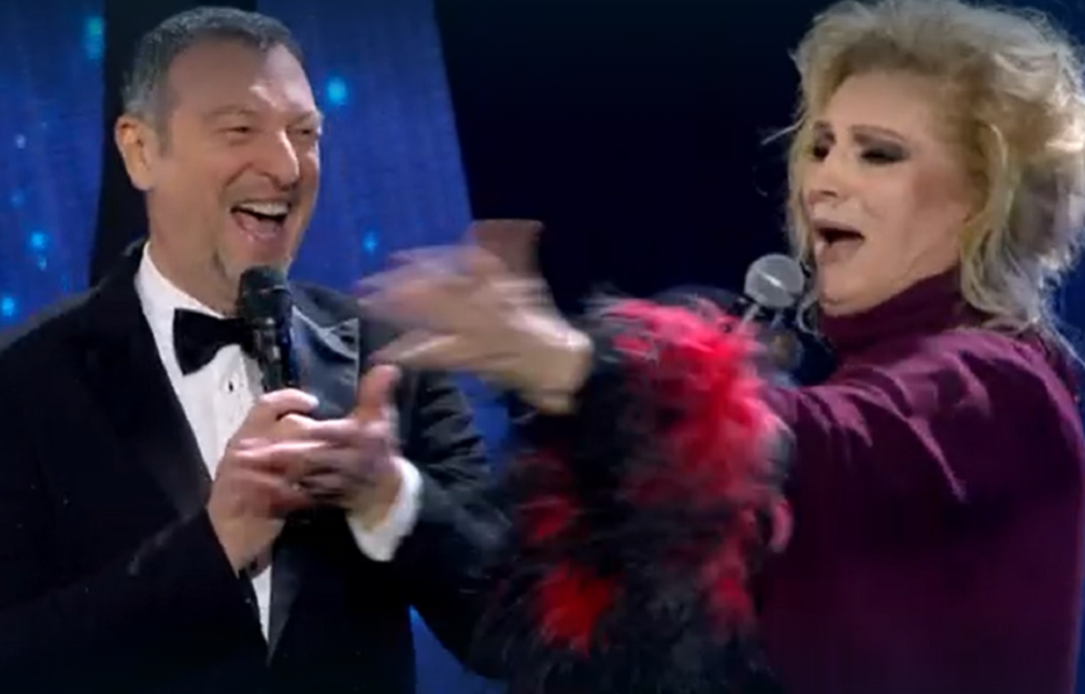 Dopo aver cantato Testarda io l’aquila di Ligonchio ha chiesto di raccontare la barzelletta. “Che devo fare, mi devo mettere nuda” – ha ribattuto ad Amadeus che le ha chiesto di cantare Zingara prima di esibirsi nel suo sketch comico. Durante l’esecuzione del brano siparietto anche con il direttore d’orchestra. “Tipo Vasco Rossi, ma porco can”… Poi è arrivato il momento della gag con Iva Zanicchi che ha riproposto una barzelletta che aveva raccontato a Ballando con le stelle.