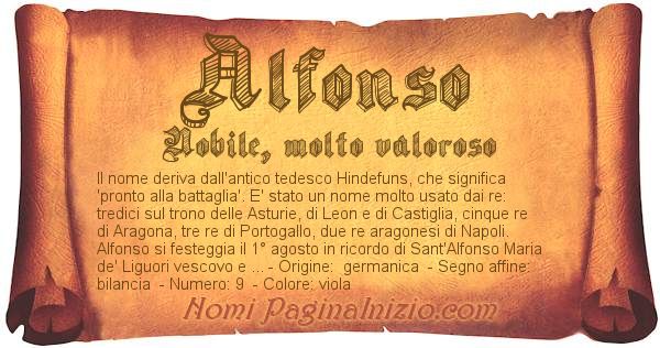 Significato del nome. Alfonso deriva dall’antico tedesco Hindefuns, che significa ‘pronto alla battaglia’. E’ stato un nome molto usato dai re: tredici sul trono delle Asturie, di Leon e di Castiglia, cinque re di Aragona, tre re di Portogallo, due re aragonesi di Napoli.